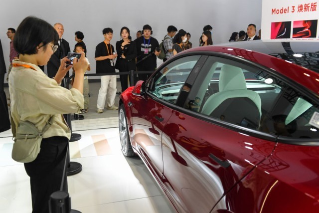 ↑9月3日,在国家会议中心的特斯拉公司展台,参观者在了解特斯拉展出的新款电动车。新华社记者 鞠焕宗 摄