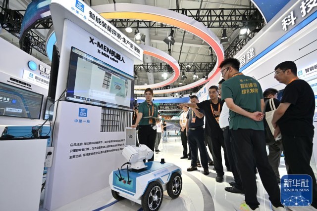 ↑9月3日,参观者在首钢园中建一局展台了解一款基于高精度室内定位的施工检测与运维改造辅助机器人。新华社记者 李鑫 摄