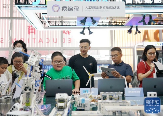 ↑9月3日,在首钢园教育服务专题展区,小朋友在体验智能硬件编程作品。新华社记者 张晨霖 摄