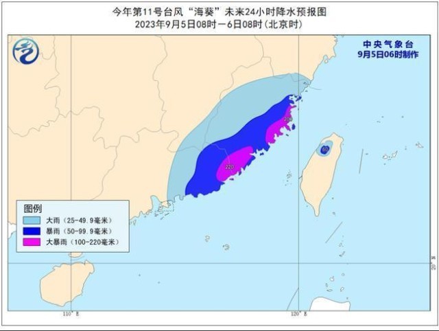 降水预报:9月5日08时至6日08时,福建大部、广东东部、江西东南部、浙江南部、台湾岛西北部等地部分地区有大到暴雨,其中,福建东部、广东东南部等地部分地区有大暴雨(100~220毫米)。上述部分地区伴有短时强降水(最大小时降雨量30~50毫米,局地可超过70毫米),局地有雷暴大风等强对流天气。