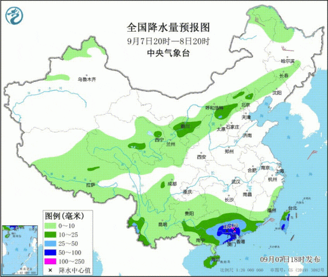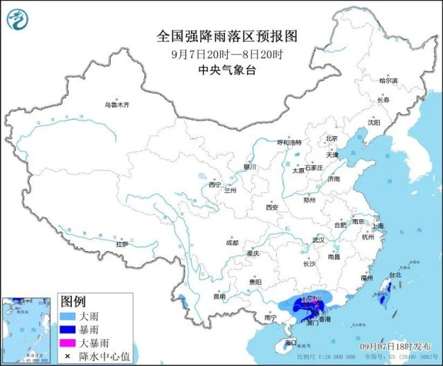 中央气象台9月7日18时继续发布暴雨黄色预警:预计,9月7日20时至8日20时,广东中西部、广西东部、海南岛中部、云南西部、台湾岛大部等地部分地区有大到暴雨,其中,广东中部和南部沿海、台湾岛东部等地部分地区有大暴雨(100至180毫米)。上述部分地区伴有短时强降水(最大小时降雨量20至50毫米,局地可超过80毫米),局地有雷暴大风等强对流天气。