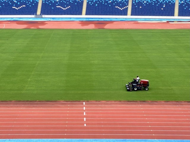 图为工作人员在温州奥体中心体育场维护草坪。新华社记者魏一骏 摄