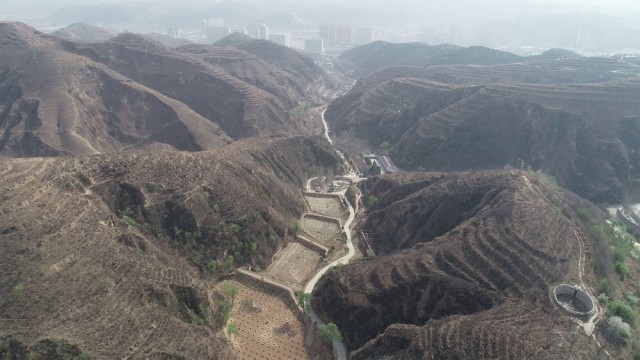 这是2019年4月18日无人机拍摄的陕西绥德水土保持科学试验站淤地坝建设成果(视频截图)。新华社记者 张晟 摄