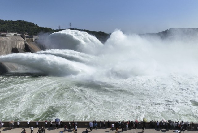 2023年6月23日,游客在黄河小浪底水利枢纽工程出水口观看调水调沙(无人机照片)。新华社发(苗秋闹 摄)