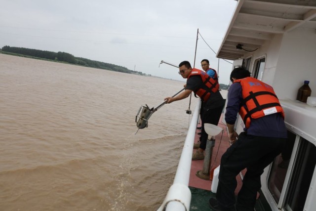 2023年6月29日,调水调沙期间,黄河下游利津水文站工作人员在进行取沙作业。新华社记者 刘诗平 摄