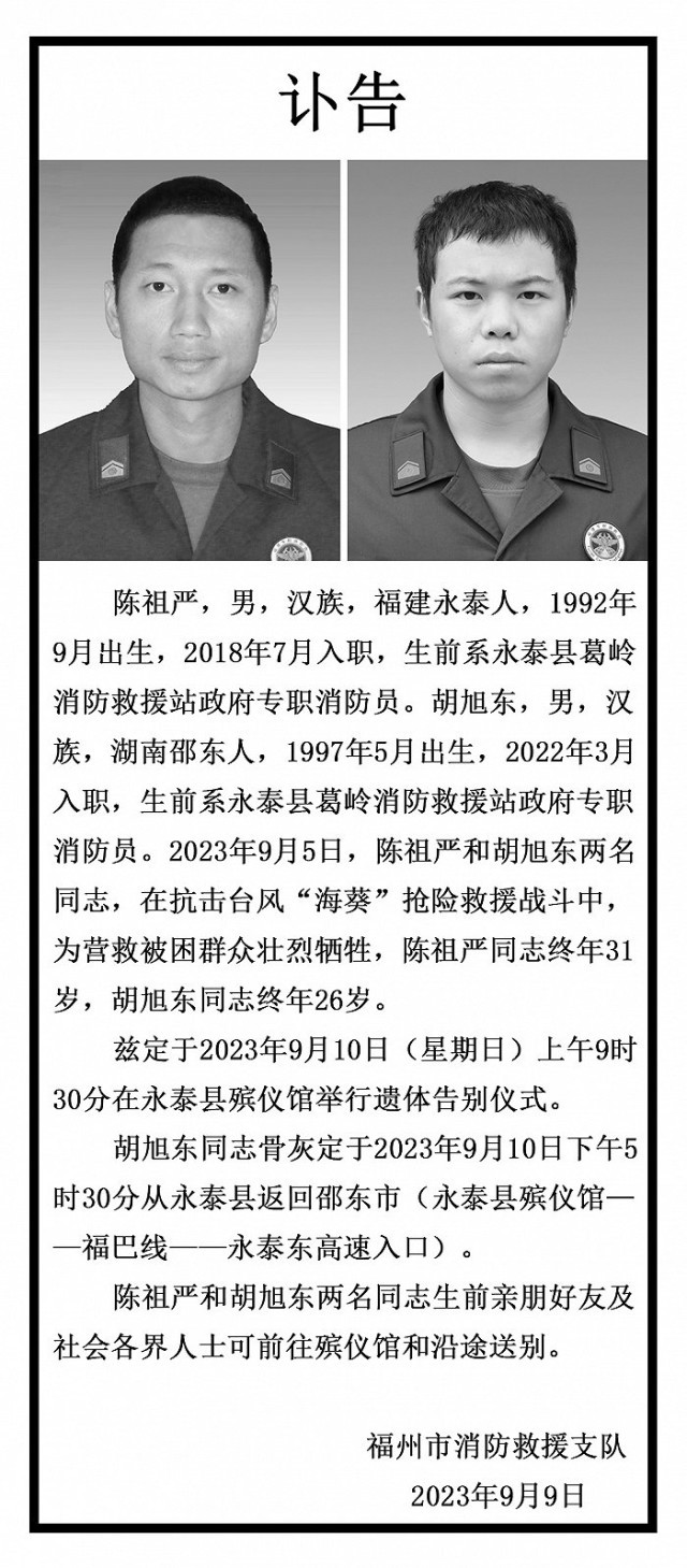 福州消防发布讣告:抗台风牺牲消防员遗体告别仪式10日举行