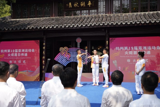 首日传递的收火仪式当天在“西湖十景”之一的平湖秋月举行,最后一棒火炬手杨倩登上舞台展示火炬。