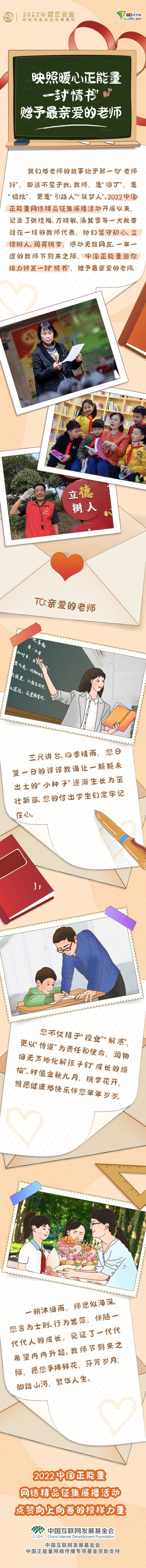 我们与老师的故事始于那一句“老师好”,却远不至于此。教师,是“园丁”,是“蜡烛”,更是“引路人”“筑梦人”。2022中国正能量网络精品征集展播活动开展以来,记录了张桂梅、方晓敏、汤其雪等一大批奋战在一线的教师代表,她们坚守初心、立德树人、润育桃李,感动无数网友。一年一度的教师节到来之际,中国正能量邀你接力转发一封“情书”,赠予最亲爱的老师。(潘晓文 朱钧有)