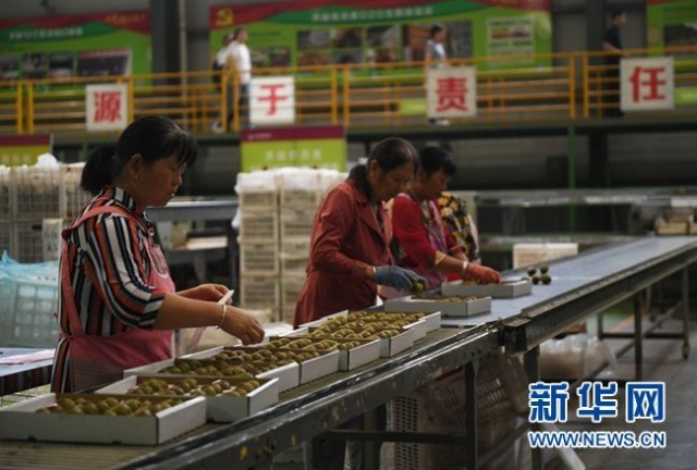 9月9日,工作人员在国家级(眉县)猕猴桃产业园区内分拣猕猴桃(新华社记者 张曼怡 摄)