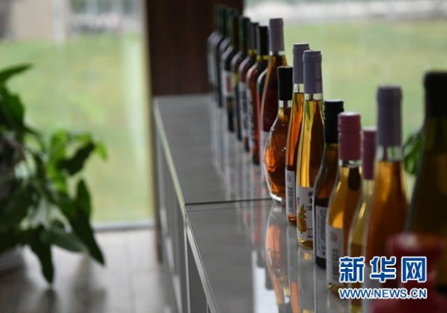 9月9日,在国家级(眉县)猕猴桃产业园区内展示的由猕猴桃酿成的各类果酒。(新华社记者 张曼怡 摄)