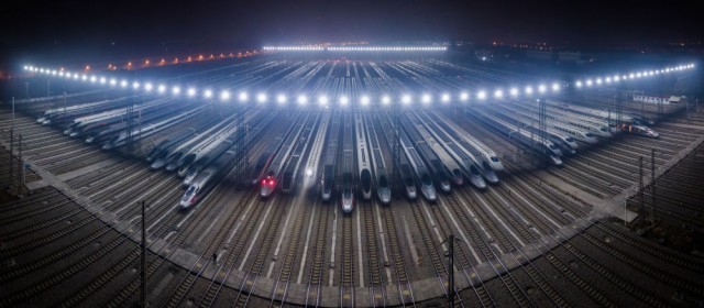 1月7日凌晨,动车组停靠在武汉动车段的存车线上进行检修和保温作业(无人机拼接照片)。新华社记者 伍志尊 摄