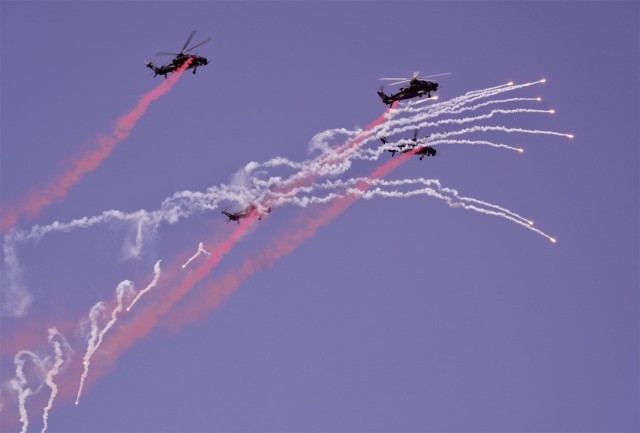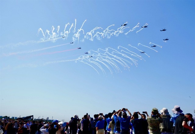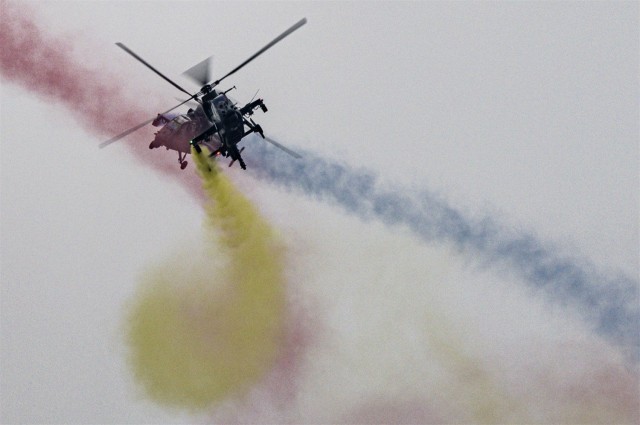 陆军“风雷”表演队7架直10武装直升机、6架直19武装直升机、2架直20战术通用直升机依次带来震撼的编队、单机表演,先后向观众演示了三机芭蕾、空中队列、尾追螺旋、四机开花等8个课目的特技飞行动作,精彩绝伦的表演让现场观众掌声不断。