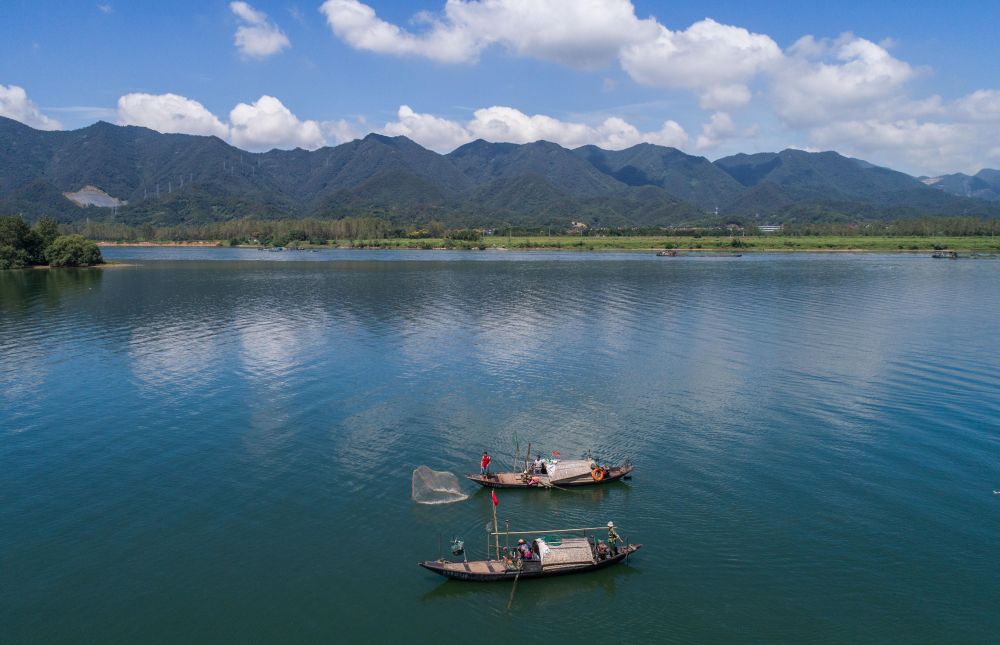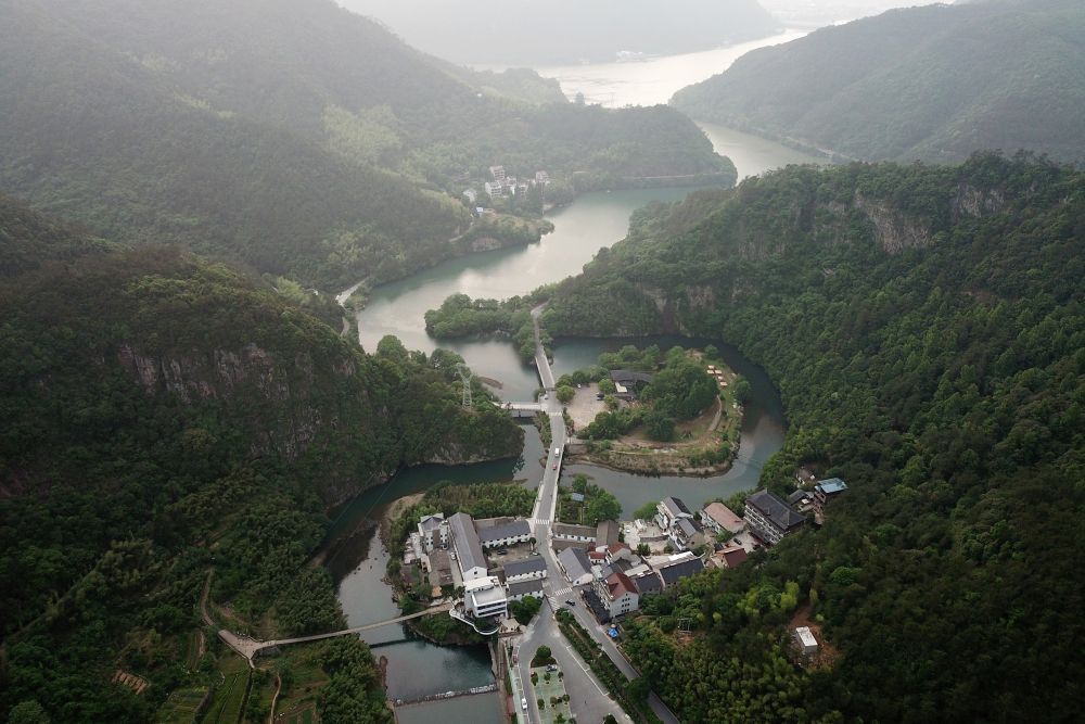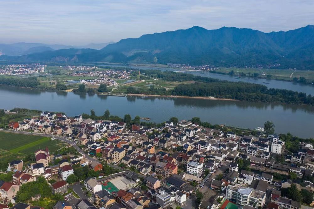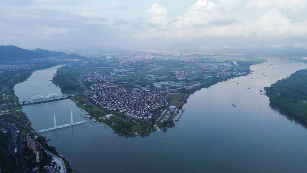 ↑空中俯瞰东洲岛。东洲岛位于北支江上游与富春江交汇口。