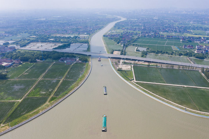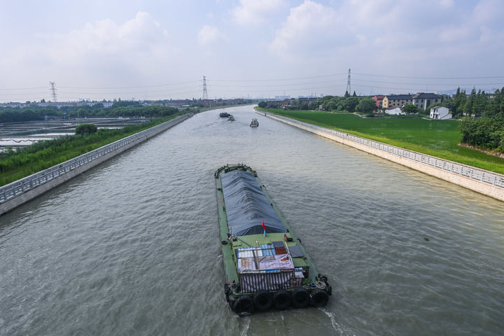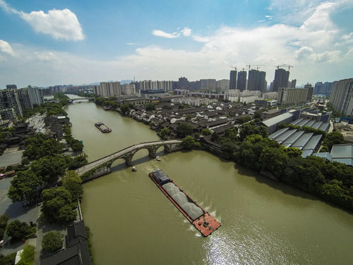 ↑首批通航货船进入京杭运河杭州段二通道驶往钱塘江。