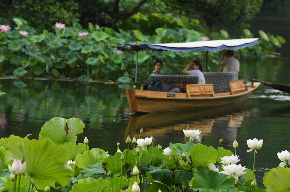 ↑古装演员在西溪湿地参加宋韵花朝节水上巡游。