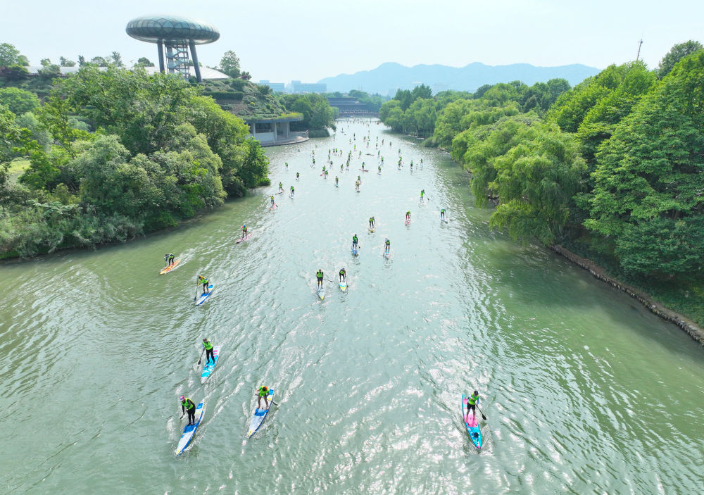 ↑市民在京杭大运河杭州临平段大运河绿道参加全民健身健步走活动。