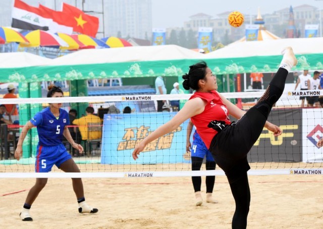 2019年亚洲沙滩藤球锦标赛女子三对三半决赛。新华社记者李紫恒摄(资料图)