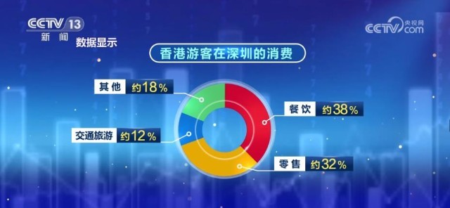 数据显示,香港游客在深圳的餐饮消费占比约38%、零售约32%、交通旅游约12%、其他占比约18%。