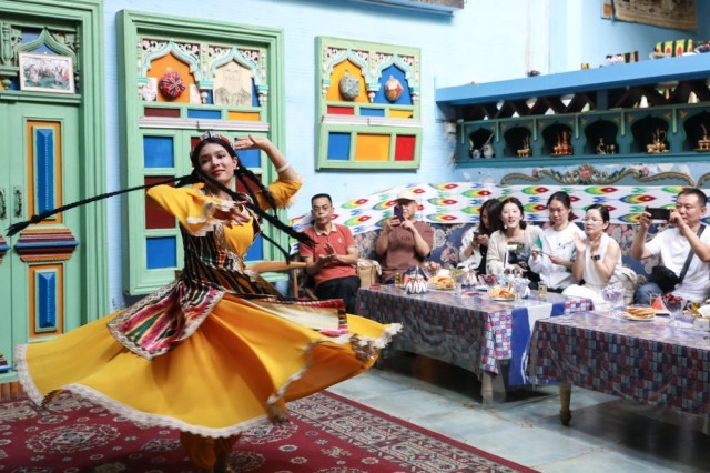 演员在新疆喀什古城景区“古丽的家”旅游家访点表演舞蹈(2023年9月7日摄)。新华社记者 程婷婷 摄