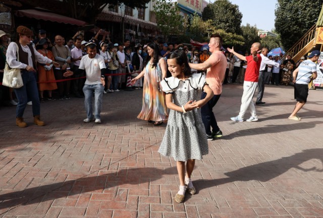 当地居民和游客在新疆喀什古城景区内随音乐起舞(2023年9月7日摄)。新华社记者 兰红光 摄