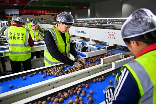 在新疆伽师县粤伽新梅产业园内的京东物流新疆智能供应链中心,员工在智能分拣线检查分选好的新梅(2023年8月30日摄)。新华社记者 丁磊 摄