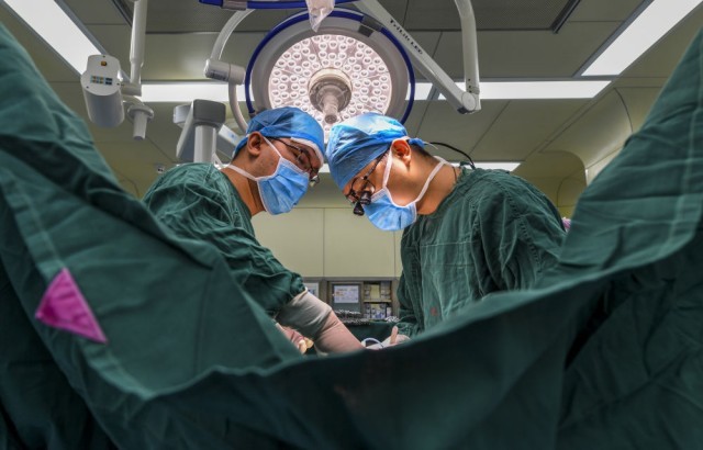 在新疆喀什地区第二人民医院手术室,上海援疆医生张俊文(右)和当地医生阿迪力江为患者做二尖瓣置换手术(2018年11月23日摄)。阿迪力江是张俊文负责培养的年轻医生之一。新华社记者 胡虎虎 摄