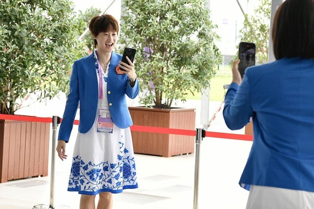 杭州籍羽毛球奥运冠军陈雨菲与队友相互拍照