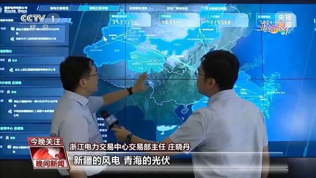浙江电力交易中心交易部主任 庄晓丹:新疆的风电、青海的光伏以及内蒙古的风电,分别通过三条特高压直流线路向浙江提供绿色电力供应。