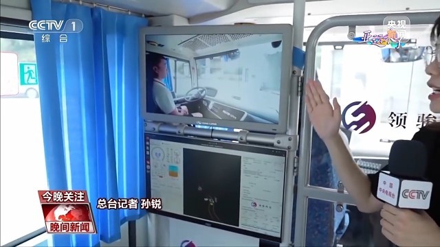 总台记者 孙锐:特别的是,多了这样的两块屏幕。上面这块可以看到驾驶室的画面,而下面这块可以看到行进中的实时路况。