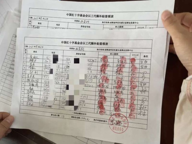 中国红十字基金会在涿州市刁窝镇西茨村实施的 “以工代赈”项目补贴签领表。刘长春/摄
