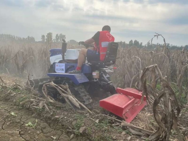 9月1日,涿州市刁窝镇佟村的玉米地里,一台多功能农耕机响声隆隆,正在为村民张大爷家免费耕地。