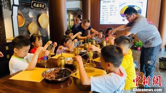 小朋友在桥西历史文化街区体验传统酸梅汤制作。