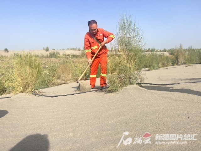9月17日,位于阿瓦提县艾西曼区域梭梭林里,身穿橘色工作服的玉苏甫江·阿里木正用沙子埋滴灌水管。天山网-新疆日报记者 拍热扎提·阿不都 摄