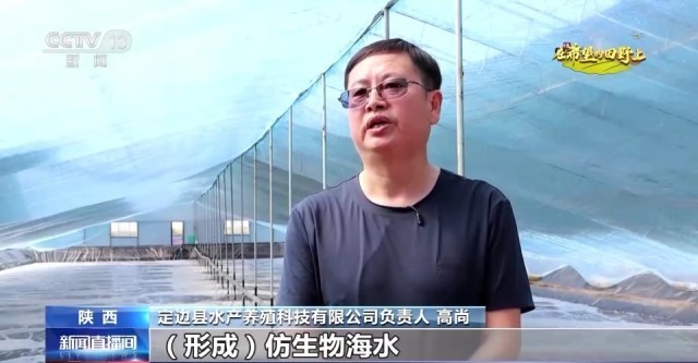 定边县水产养殖科技有限公司负责人 高尚:盐湖的水,盐度比较高,我们也兑了一定的淡水,形成仿生物海水,这就是咱们养殖海产品的基本条件。