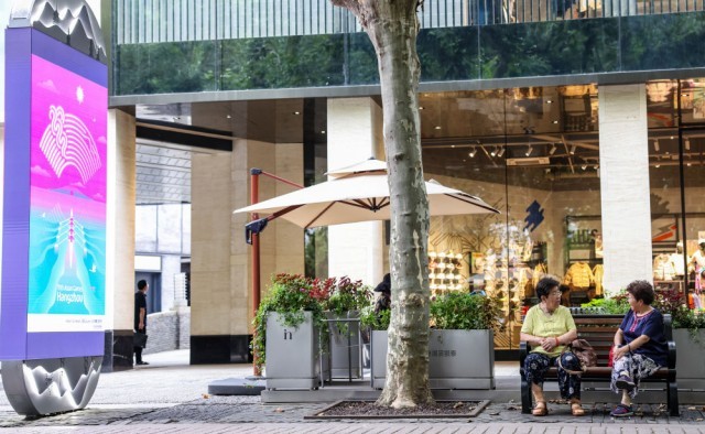在亚运会三人篮球场馆所在地湖州市德清县,地理信息小镇市民广场里新设的“舞家红驿站”开门迎客。驿站以党员先锋小板凳、便民服务小方屋、市民活动小集市为主要功能。