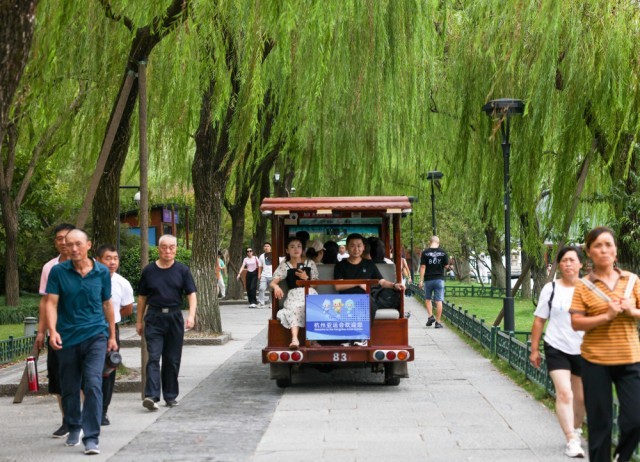 9月20日,游客乘坐杭州西湖景区观光车游览。新华社记者颜麟蕴 摄