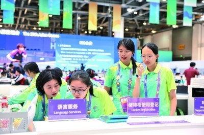 9月22日,亚运会主新闻中心的志愿者们在工作。本报记者 杨震摄/光明图片