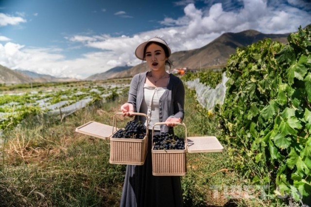 图为游客在山南市桑日县帕竹葡萄采摘园采摘水果