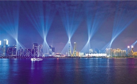 连日来,杭州奥体中心场馆群璀璨夺目的灯光秀,将迎接亚运的氛围拉满。记者 梁臻 姚颖康 拍友 余文华 摄