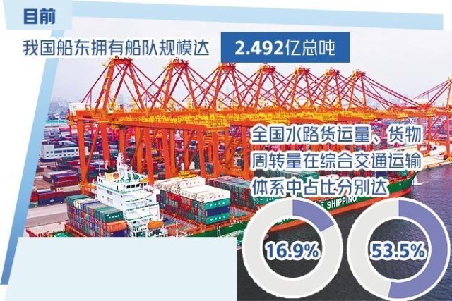 “目前,我国船东拥有船队规模达2.492亿总吨,从总吨上成为世界最大船东国。我国海运服务网络遍及全球,内河航运优势进一步发挥,全国水路货运量、货物周转量在综合交通运输体系中占比分别达到16.9%和53.5%,有力服务国家经济社会发展。”在近日举行的北外滩国际航运论坛新闻发布会上,交通运输部水运局相关负责人介绍了航运业高质量发展最新进展。