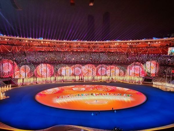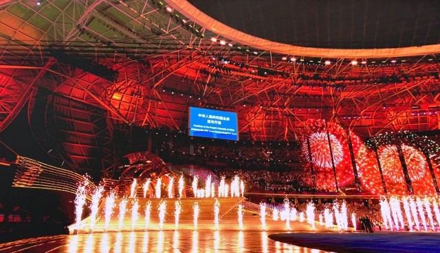 9月23日,杭州第19届亚洲运动会开幕式现场,灿烂的数字烟花照亮杭州奥体中心体育场(大莲花)。(直播画面截图)