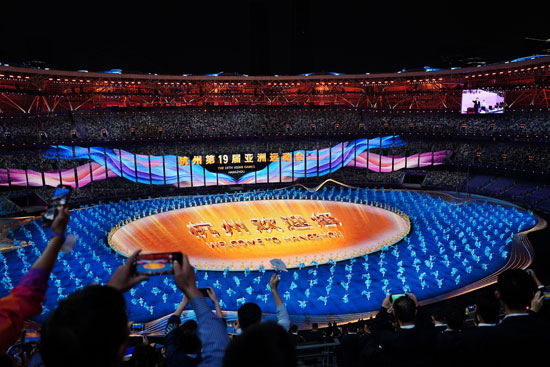 9月23日,杭州亚运会开幕式,观众席数控装置流动点亮,在地屏勾勒出“杭州欢迎您”(WELCOME TO HANGZHOU)巨幅字样。中青报·中青网记者 赵迪/摄