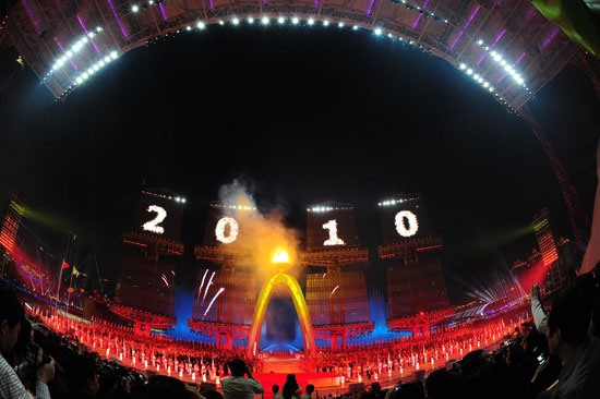 2010年11月12日,广州,第十六届亚运会开幕式在海心沙岛隆重举行,图为主火炬点火仪式。视觉中国供图