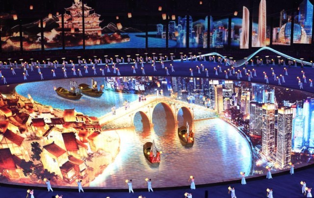 开幕式现场出现了杭州拱宸桥的形象。始建于1631年的拱宸桥,是京杭大运河南端的标志性建筑。2014年6月,中国大运河成功申报世界文化遗产,拱宸桥作为运河水工建筑,成为一处遗产点。