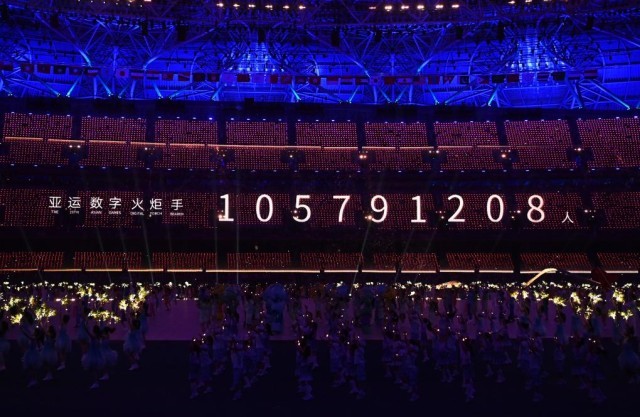 这是9月23日拍摄的开幕式现场显示的亚运数字火炬手人数。新华社记者 黄宗治 摄
