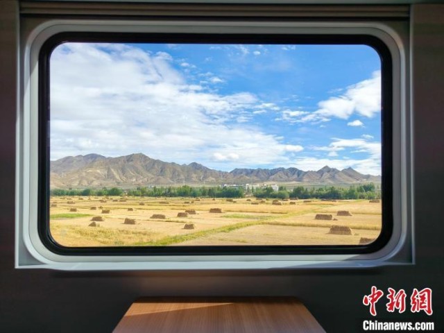 9月23日,从西藏日喀则开往拉萨的C886次列车上望向窗外,是一片丰收堆垛的青稞地。中新社记者 江飞波 摄