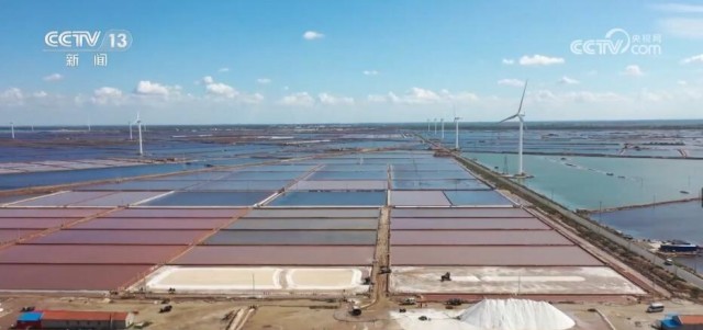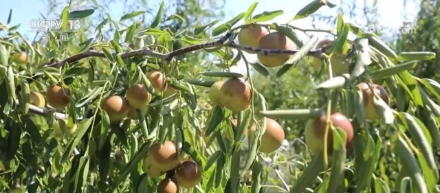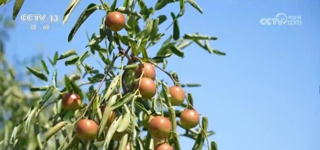 总台记者 朱路鹏:我现在是在山东东营河口区枣兴新村冬枣种植园里,大家可以看到在我右手边就是盐碱地中常见的植物盐地碱蓬,而我左手边却枝繁叶茂、瓜果飘香,一颗颗脆甜饱满的冬枣挂满枝头,一派丰收景象。