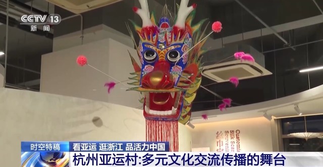 现在我来到了杭州亚运村运动员村的文化屋,在这儿随处可以找着浙江各地的非遗文化。比如说一抬头你就会发现一条长度60多米的“中华龙”风筝,它由100余只小风筝拼接而成,而且它不仅仅是用来欣赏,真的可以飞。借用“中华龙”这样的意象,也是想祝福所有的运动员在亚运会期间旗开得胜,取得好成绩。这条寓意满满的“中华龙”风筝出自杭州市余杭区的风筝制作大师之手。