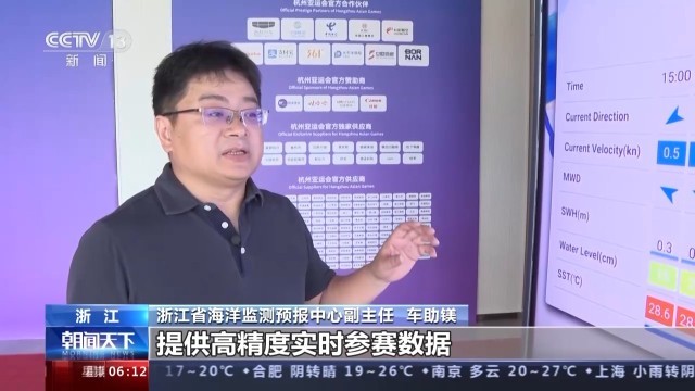 浙江省海洋监测预报中心副主任 车助镁:这是未来三小时的海洋预报信息,流向、流速、平均波向、涌高、水位、水温,这些信息将为亚运会帆船运动员提供高精度实时的参赛数据。