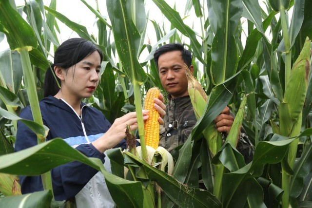 河北省邢台市南和区的农技人员在范庄村查看玉米灌浆情况。新华社记者赵鸿宇 摄